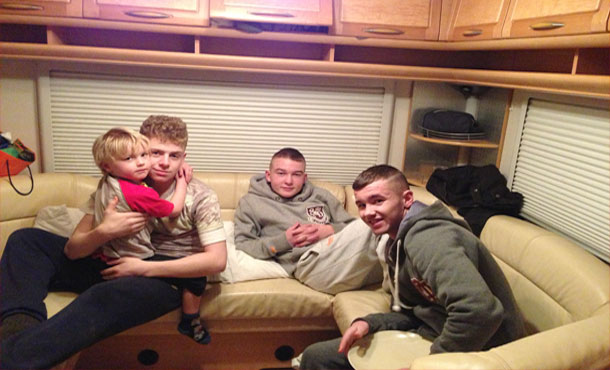 A: "I think you might already know the answer to that, you've been there" he grinned, "It's fun and I like the simple things in life. When we go to bed in the caravan we can all talk to each other until we drift off to sleep. It rounds off the day. We couldn't do that if we were all in different rooms. I like sitting around the camp fire with my family. It's cozy and they love it. I also don't want my children to grow up spoilt just because their dad has a few quid. If I give them the best of everything now then they'll have nothing to look forward to.